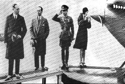 Ceremonia de bautizo del avión "Ricaurte". De izquierda a derecha, Doctor Enrique Olaya Herrera, el periodista Carlos Puyo, el teniente Aviador Benjamín Méndez Rey y doña María Olaya Aya, quien actuó como Madrina. En la ceremonia de partida tambien se encontraba presente el escritor José Eustasio Rivera.